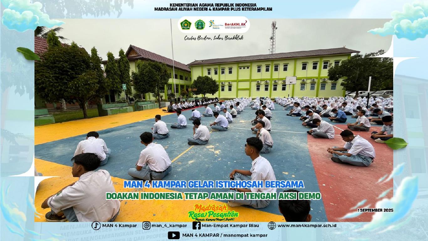 Kampar (MAN 4 Kampar) – Menyikapi situasi nasional yang tengah memanas akibat aksi demonstrasi di berbagai daerah, MAN 4 Kampar Plus Keterampilan menggelar kegiatan Istighosah dan doa bersama sebagai bentuk kepedulian terhadap kedamaian bangsa, Senin (1/9/2025).
